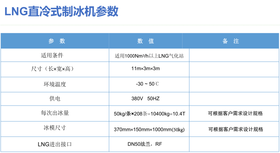 我公司最新研發(fā)生產(chǎn)的新型的LNG直冷式制冰機(jī),可以將LNG中的冷能進(jìn)行有效利用--制成冰塊,冰塊用于生產(chǎn)和日常生活中,變廢為寶,可獲得可觀的經(jīng)濟(jì)效益。